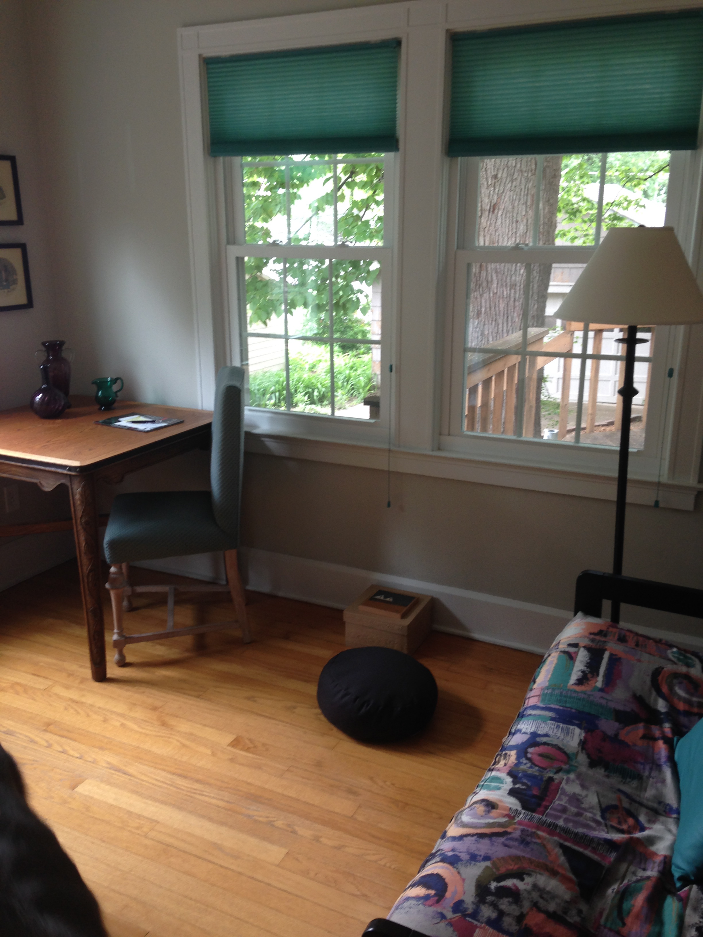 this place of practice is a south-west corner room and it offers lovely light, the sight of a big tree and access to much birdsong