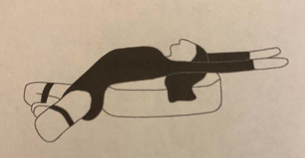 Sukhāsana/simple sit: Sit with spine straight and elevated. Sit on blankets to elevate if knees are higher than hips. 2x changing the cross of the legs.
