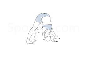 Adho Mukha Svanasana / downward -facing dog: Try to do this down dog off the mat, so your hands and feet may tend to slip. Try to pull up to the hips (the peak of the pose) instead of stretching. Hold for a minute keeping the neck long.